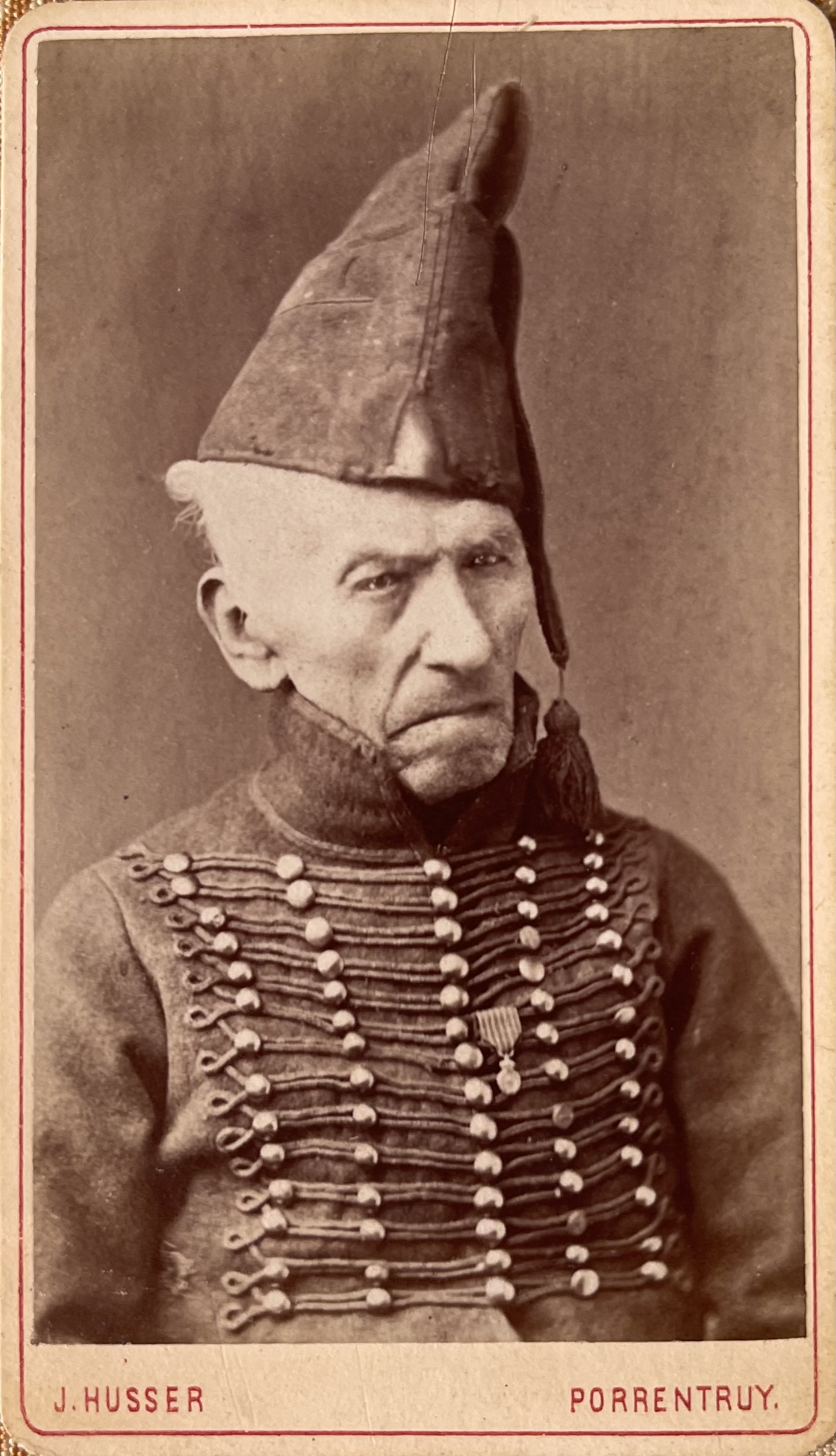 La photographie, réalisée à la fin du XIXᵉ siècle, montre l’ancien soldat portant son uniforme, témoignage exceptionnel de la mémoire napoléonienne en Suisse romande et du passage fréquent des miliciens helvétiques vers le service impérial.